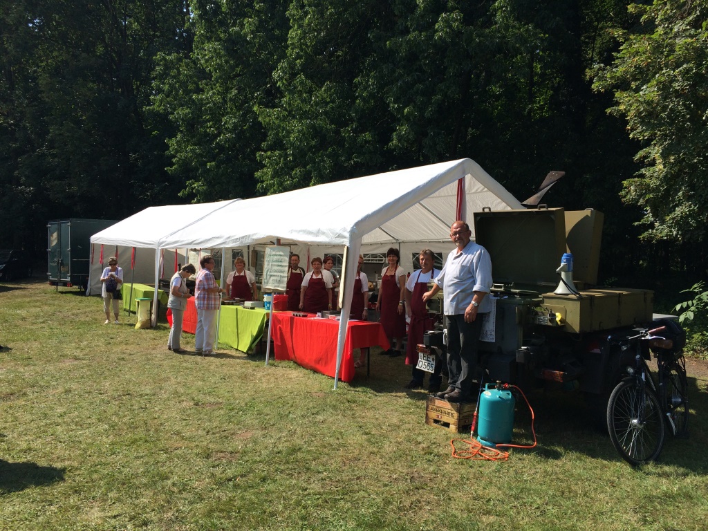Bei größeren Veranstaltungen und Volksfesten fahren wir mit unserer Feldküche vor und schenken leckeren Gulasch und Erbseneintopf aus.